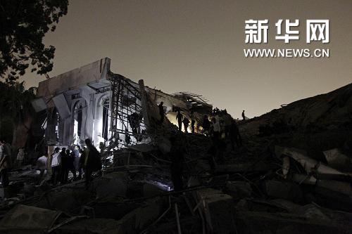 4月25日,在利比亚首都的黎波里,利比亚安全人员查看被轰炸的利比亚领导人卡扎菲的官邸。北约战机25日凌晨对利比亚领导人卡扎菲在的黎波里的官邸实施轰炸。利比亚政府官员谴责北约企图杀害卡扎菲,并称轰炸造成45人受伤、卡扎菲办公室受损严重。新华社/法新