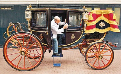 威廉和凯蒂婚礼当天极可能下雨,王室职员在擦拭玻璃马车以备随时使用。