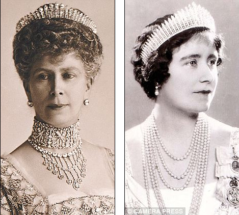 “乔治三世皇冠”是皇室珠宝饰物中的一件,在1919年为玛丽女王(左)打造成为王冠,后于1937年传给新女王(右),即她的儿媳。