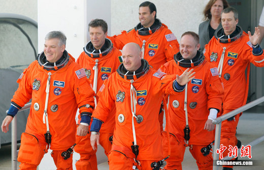 2011年4月1日,“奋进”号航天飞机的机组人员在美国佛罗里达州卡纳维拉尔角NASA的发射基地亮相。