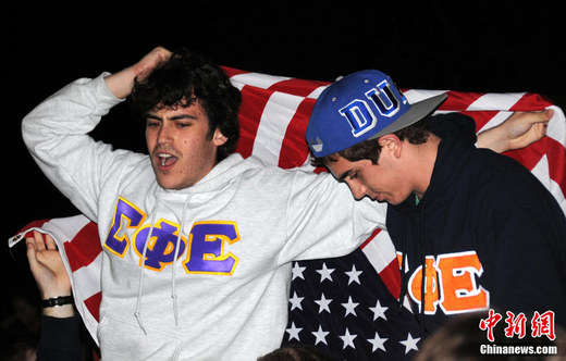 美国总统奥巴马1日晚突然召开记者会,正式宣布基地组织头目本·拉登已经死亡。在奥巴马发表演讲前后,许多美国民众已高举国旗聚集到白宫附近,他们高呼口号,庆祝拉登之死。 中新社记者 德永健 摄