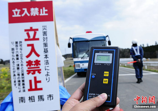 4月26日,中新社记者一行当天抵达位于日本福岛县南相马市原町的福岛第一核电站泄露事故20公里警戒圈,尽管此处的放射线测量数值处于安全水平,但仍可见警方竖起的“禁止入内”的告示牌。中新社记者 侯宇 摄