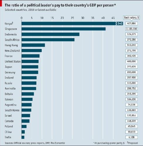 《经济学人》通过对官方资料、媒体报道和国际货币基金组织数据进行分析,为若干国家元首及地区领导人的“年薪”占人均GDP比率排行,肯尼亚总理奥廷加(Raila Odinga)以年薪是人均GDP的240倍(以购买力平价为计算标准),排在第二位的是新加坡总理李显龙,他的年收入是该国人均GDP的40倍,同时也以逾218万美元的年收入冠绝各国领袖。在排行榜的另一端,则是中国和印度的领导人,他们的年收入与人均GDP的比率最低。