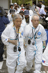 当地居民们从上午9点左右集合到第一核电站20公里外的村民体育中心,在听完村政府关于注意事项的说明后,在此穿上防护服以防止放射性物质的附着。