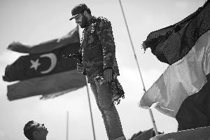 13日,利比亚班加西,一名反对派武装士兵在实施警戒。卡扎菲13日在一段只有声音没有画面的讲话中否认自己受伤。