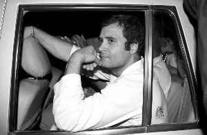 5月11日,印度执政党国大党总书记拉胡尔·甘地被捕后向媒体示意。