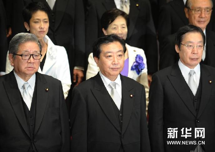9月2日,在日本东京,日本首相野田佳彦(前排中)率内阁成员集体亮相。新华社发(关贤一郎摄)