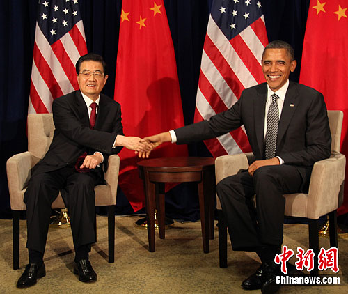 当地时间11月12日下午,中国国家主席胡锦涛在夏威夷州首府檀香山会见美国总统奥巴马。中美两国元首十天之内再次会晤。中新社发 张朔 摄
