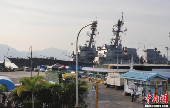 2011年6月28日,菲律宾和美国海军2011年度“海上联合战备训练演习”CARAT在菲律宾西南部巴拉望省省会普林塞萨港市开幕。图为停靠在港口的美国海军导弹驱逐舰“钟云”号(93)和“霍华德”号(83)。中新社发 ERIC 摄
