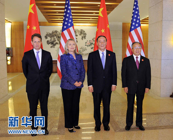 5月3日,第四轮中美战略与经济对话在北京开幕。这是开幕式前,王岐山、戴秉国和希拉里·克林顿、盖特纳合影。 新华社记者 李涛 摄