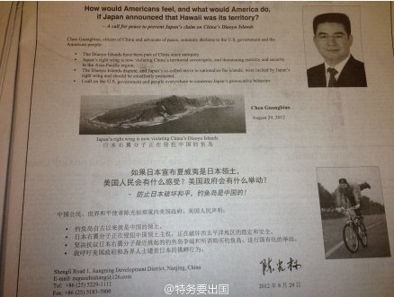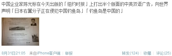 中国企业家、江苏黄埔再生资源利用有限公司董事长陈光标在31日的美国《纽约时报》上登出半版广告, “郑重向美国政府、美国人民声明”,钓鱼岛自古以来就是中国的领土。