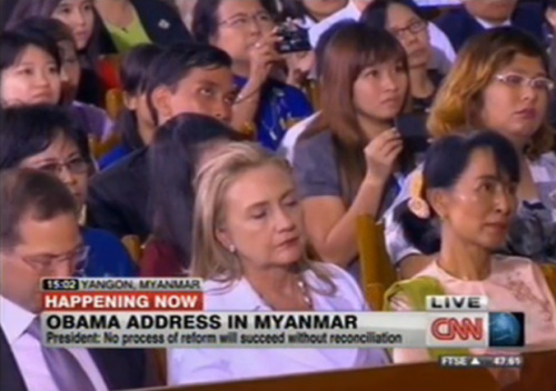 当天,坐在希拉里身旁听奥巴马演讲的是缅甸全国民主联盟领导人昂山素季。