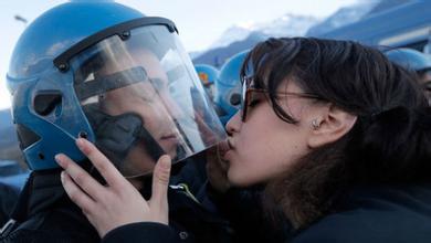 资料图:意大利防爆警察遭美女“强吻”。
