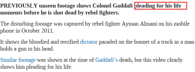 而最新的视频从一个新的视角捕捉到卡扎菲的最后时刻,清楚地看到他祈求士兵放他一条生路的画面。视频显示,卡扎菲被处决之前,士兵们在卡车上疯狂地虐待他,尖叫声不断。可以听到,在被一个枪手指着他满是血迹到的头部时,卡扎菲在祈求放他一条生路。
