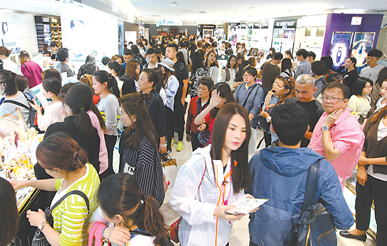 图片说明:1日,韩国首尔一大型免税店内挤满了中国游客。