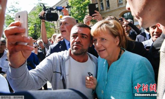 资料图:柏林的一处难民营外,一位移民拿起手机与德国总理默克尔自拍合影。