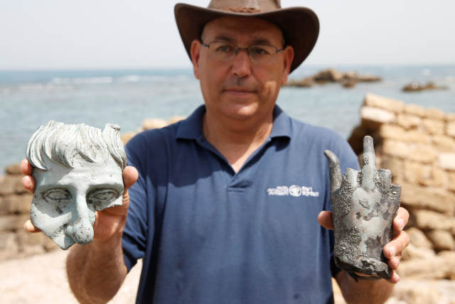 5月16日,在以色列海滨城市凯撒里亚,一名以色列文物管理局的工作人员展示附近海域发现的沉船文物。