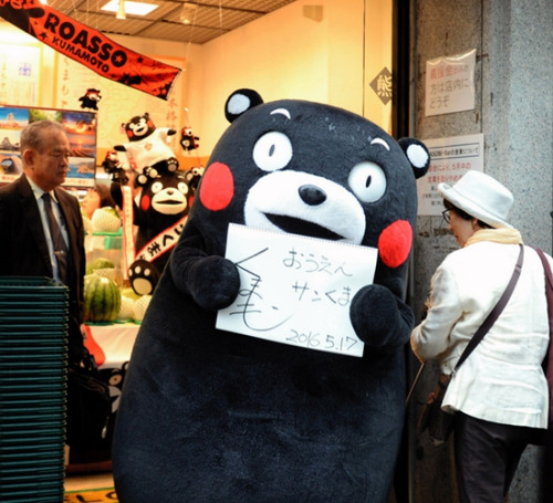 中新网5月18日电 据日媒报道,日本熊本县的吉祥物“熊本熊(酷MA萌)”本月17日现身东京都中央区的该县特产直销店“银座熊本馆”,向支援熊本地震灾区的来店顾客表达谢意。