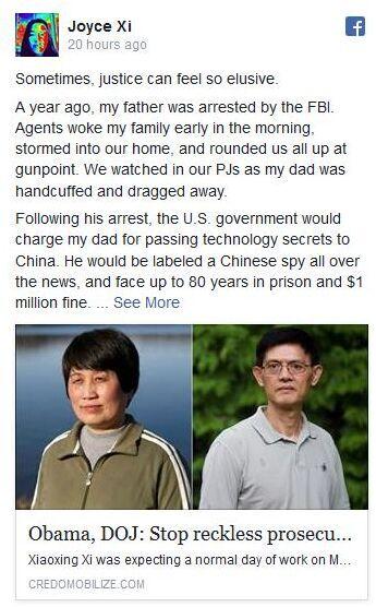 郗雨姗在脸书上写道:自己的父亲郗小星不是唯一一个被美国政府错误指控的华裔科学家。 其他华裔科学家如陈霞芬(SherryChen)、曹国庆(Cao Guoqing)和李书玉(ShuyuLi)也经历了相同的事,他们被控间谍罪,后来又被毫无原因地撤销指控,但是造成的后果对所有人的家庭都是毁灭性的,而政府却完全不用为此负责。