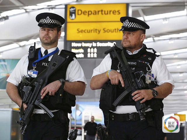 图为警察在希思罗机场5号航站楼内巡逻。(图片来源:新华/路透)