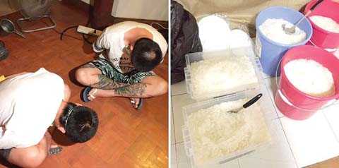 图为菲缉毒署人员在拉斯宾迎斯市菲美人寿村一个疑似毒品工场内逮捕的2名台湾人和毒品。