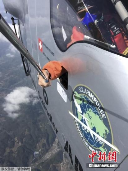 2015年4月21日,全球最大太阳能飞机“阳光动力”2号从重庆飞往南京的航程中,飞行员伯特兰·皮卡德(Bertrand Piccard)手拿自拍杆伸出飞机,坐在机舱里自拍。