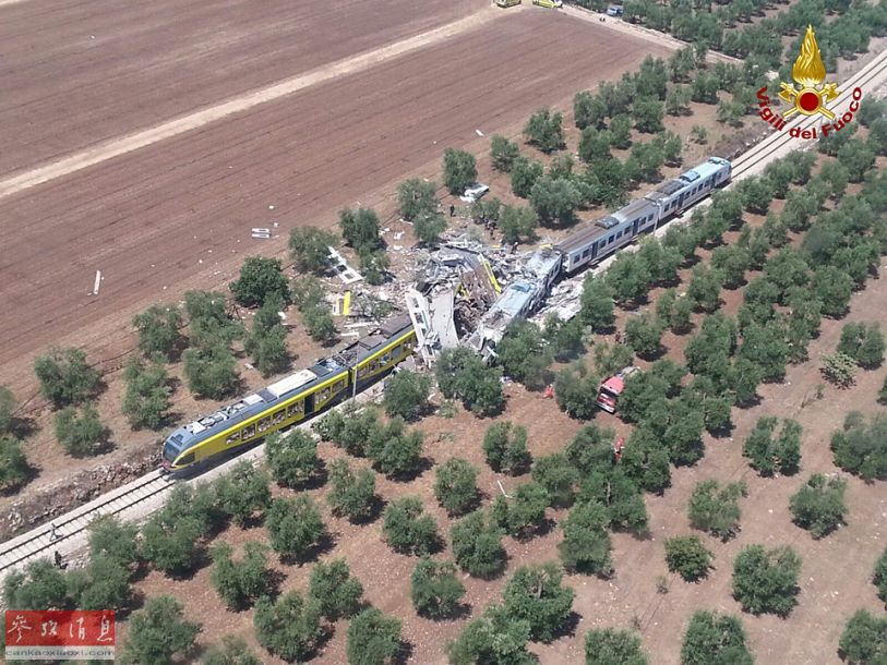 意大利发生火车相撞事故 车厢完全撞碎25人遇难