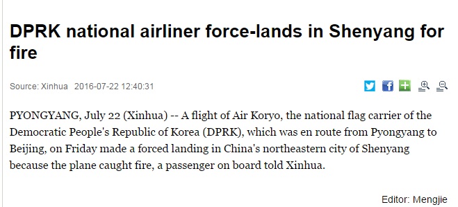 据新华社报道,朝鲜高丽航空一航班因为飞机起火,在沈阳迫降。该航班系从平壤飞往北京。