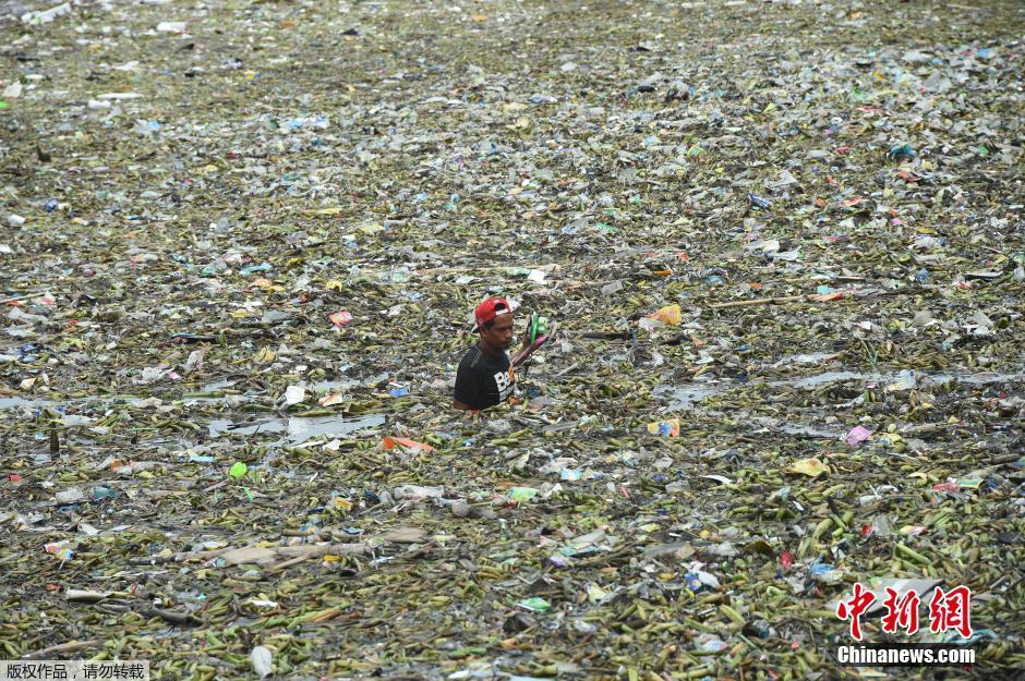 当地时间8月1日,菲律宾马尼拉,一名男子清理台风妮妲掀起的巨浪带来的垃圾。据菲律宾大气地球物理和天文管理局表示,台风妮妲已经离开菲律宾,但仍在影响北吕宋西北地区。