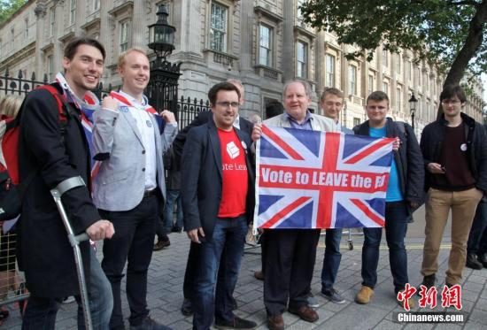 当地时间6月24日,英国“脱欧”公投计票结果揭晓,多数投票者赞成英国脱离欧盟。图为“脱欧派”支持者在伦敦市中心庆祝。中新社记者 周兆军 摄