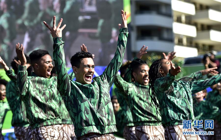 8月2日,舞蹈演员表演巴西特色舞蹈欢迎参加升旗仪式的各代表团。当日,51个体育代表团在2016年里约奥运会奥运村举行升旗仪式,里约奥组委特地从巴西各地挑选了数十名舞者,为各国代表团现场表演融合了桑巴等多种巴西代表性舞姿的舞蹈,邀请各国运动员一起感受里约热内卢的热情。新华社记者岳月伟摄
