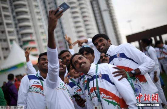 资料图:印度代表团的几位成员在奥运村前高举手机自拍合影。
