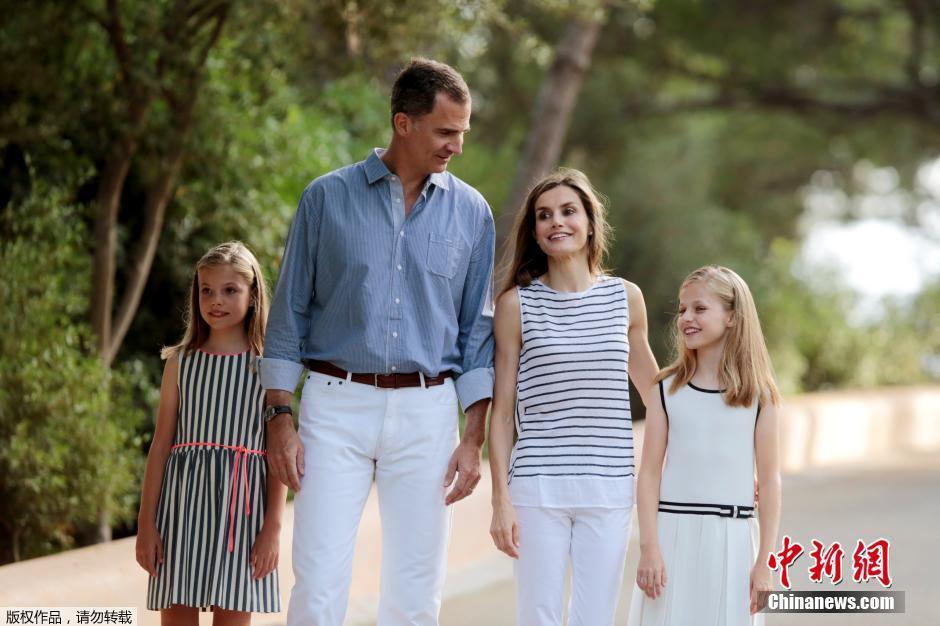 当地时间2016年8月4日,西班牙马洛卡岛帕尔马,西班牙国王菲利普和王后莱蒂齐亚带着公主利奥诺和索菲亚在玛丽温特宫拍摄全家福。