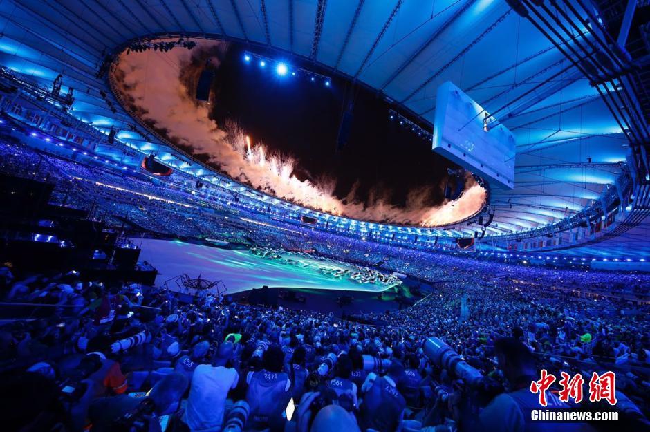 当地时间8月5日晚8时,2016里约奥运会开幕式在里约热内卢马拉卡纳体育场举行。图为开幕式现场表演。中新网记者 盛佳鹏 摄