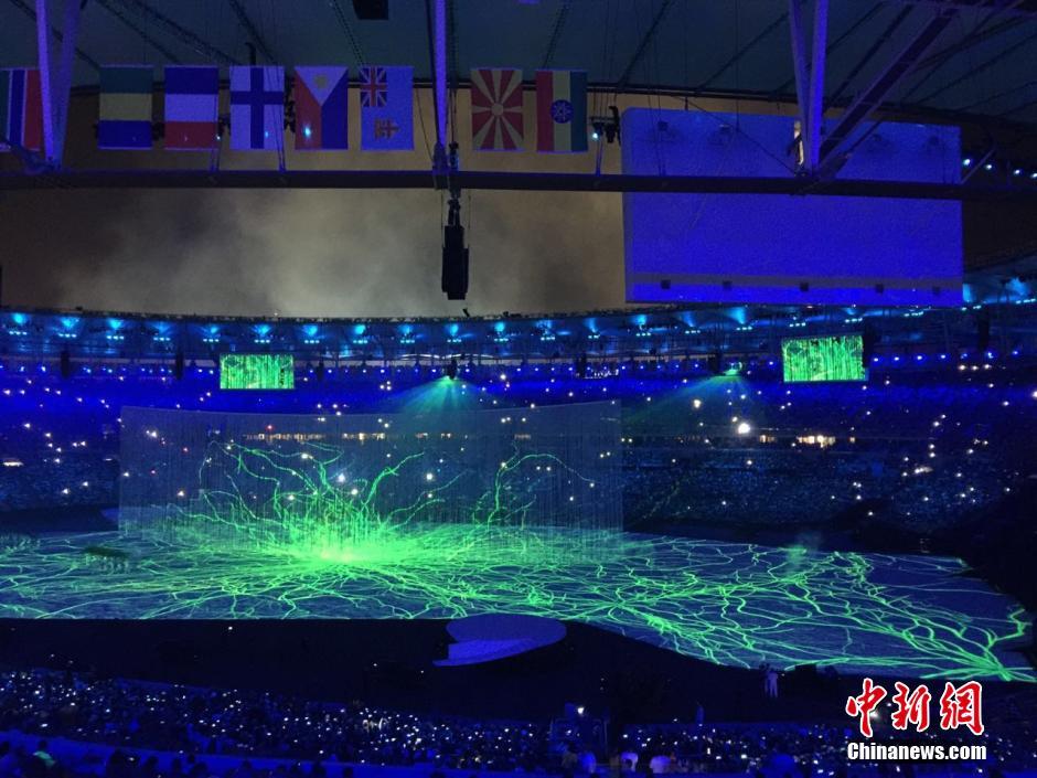 当地时间8月5日晚8时,2016里约奥运会开幕式在里约热内卢马拉卡纳体育场举行。图为开幕式现场表演。中新网记者 卢岩 摄