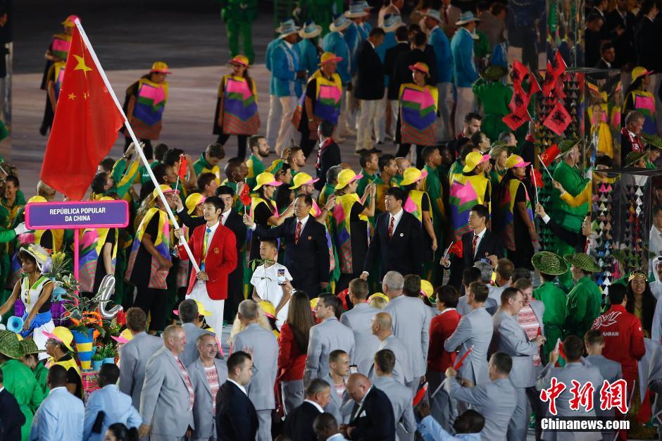 当地时间8月5日晚8时,2016里约奥运会开幕式在里约热内卢马拉卡纳体育场举行,各国代表团入场。图为中国代表团入场,雷声担任旗手。中新网记者 盛佳鹏 摄