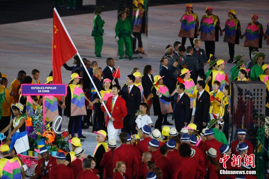 当地时间8月5日晚8时,2016里约奥运会开幕式在里约热内卢马拉卡纳体育场举行,各国代表团入场。图为中国代表团入场,雷声担任旗手。中新网记者 盛佳鹏 摄
