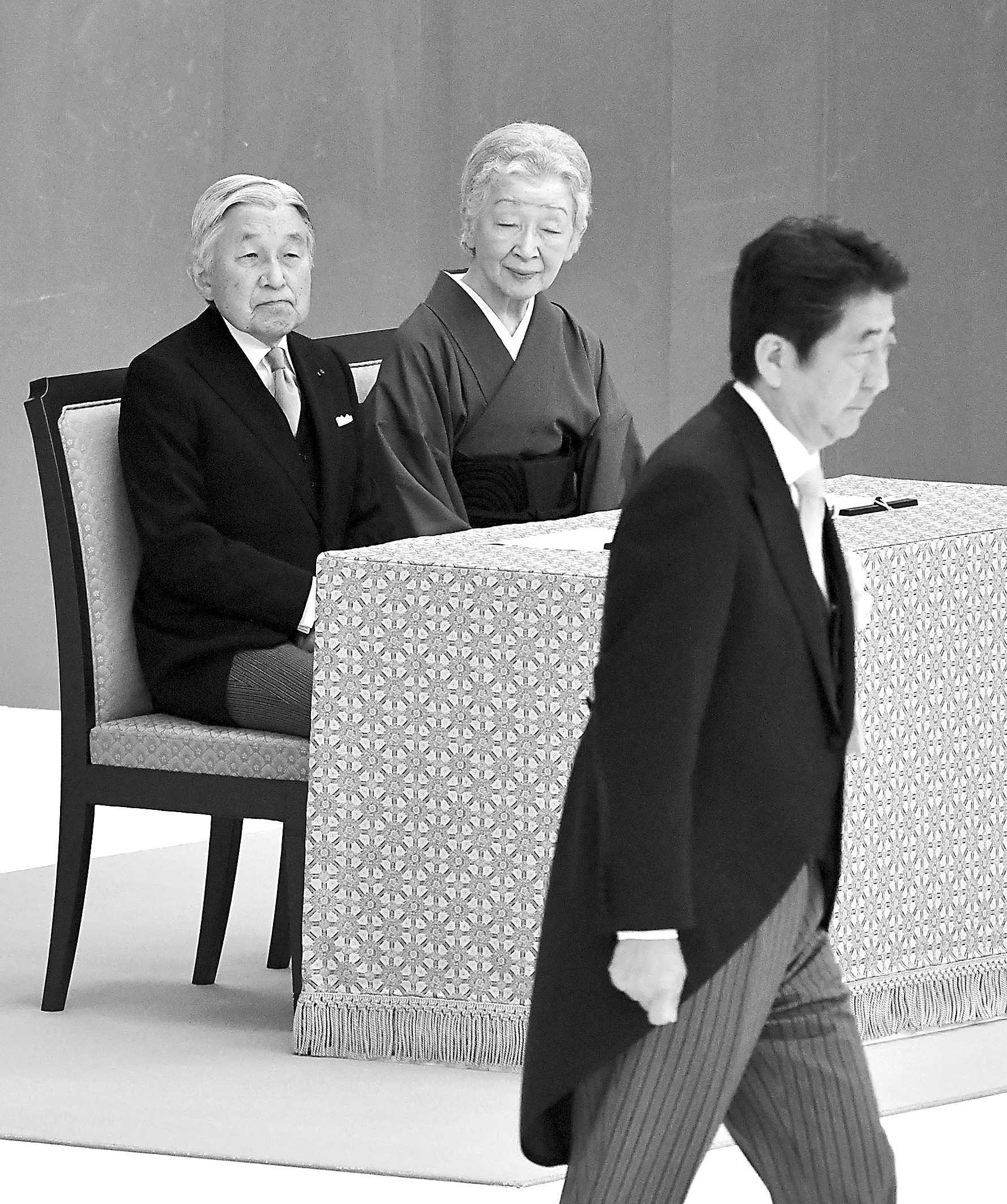 15日,日本天皇夫妇与首相安倍晋三在日本“全国战殁者追悼仪式”上。