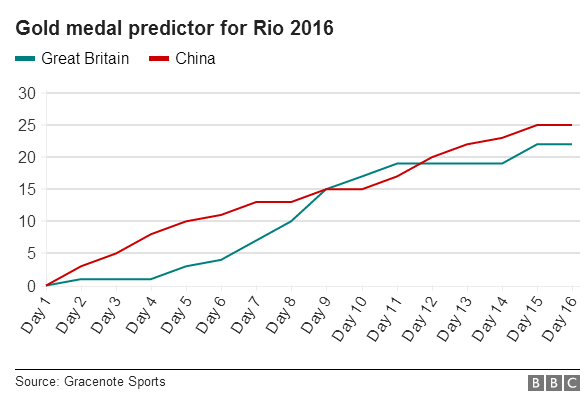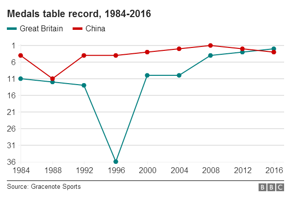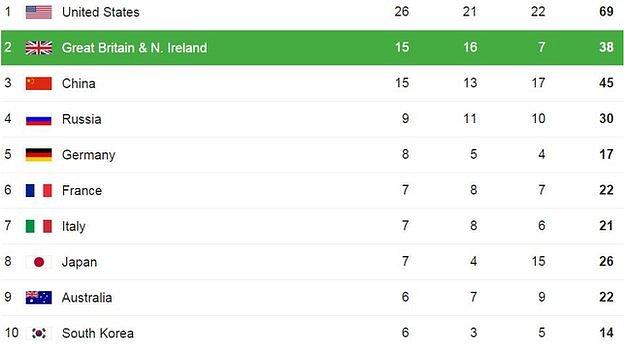 BBC称,自1984年新中国开始参加奥运会以来,中国队已收获金牌200余枚,而至今英国还从来没有在奖牌榜上超越过中国。不过,奥运会第九天的比赛日结束之后,英国与中国同样拿到15枚金牌,但由于银牌数领先中国,所以英国排在了奖牌榜第二。英国在奥运开始前制定的目标是,本届赢回至少48枚奖牌,拿到伦敦奥运会之外的历史最好成绩。