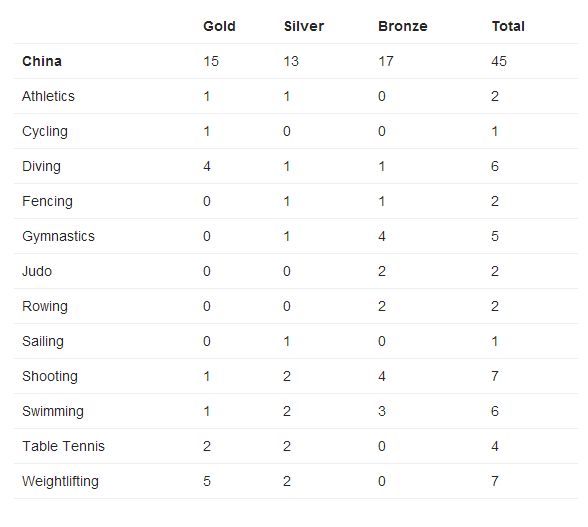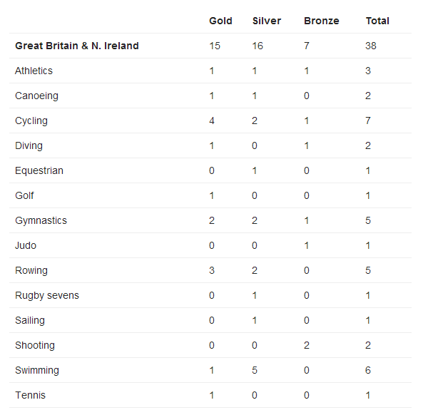 目前英国队15金16银7铜的表现,比在2012年伦敦奥运会同期表现多一枚奖牌,比在北京奥运的同期多了13枚。英国的所有奖牌来自于14个不同的大项,其中在自行车、游泳、体操和赛艇项目上表现最好。而中国第九个比赛日之后拿到了45枚奖牌,15金13银17铜,来自于12个大项。中国队在跳水和举重上取得了很大的成功,当然,在羽毛球与乒乓球上,一直都具有统治力。