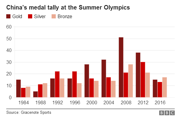 报道称,在08年的北京奥运会中,中国比美国多拿到了15枚金牌,这是中国首次登上奖牌榜的首位,而过去的八届夏季奥运会当中,中国也只有一次没有进入奖牌榜前四,那就是1988年奥运会,当时中国以5枚金牌的成绩排在第11。而在同一时期,英国奥运会奖牌榜的最好成绩是第三,而最低的一届是1996年奥运会的第36位,那一届奥运会他们只拿到过一枚金牌。