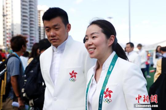 资料图:帖雅娜、唐鹏夫妇参加中国香港奥运代表团在里约奥运村举行升旗仪式。中新网记者 富田 摄