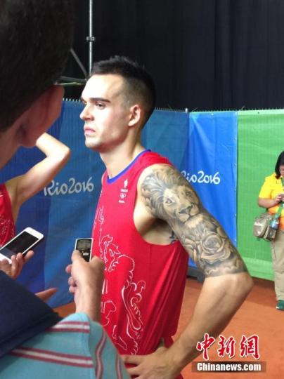 资料图:2016里约奥运羽毛球混双小组赛首轮比赛,图为爱德考克的狮子文身吸引媒体镜头。中新网记者 卢岩 摄