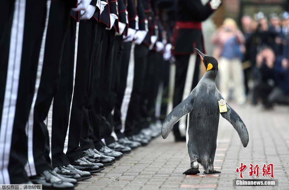 8月22日,在英国苏格兰首府爱丁堡,爱丁堡动物园的一只名为“尼尔斯·奥拉夫”的帝企鹅“检阅”参加爱丁堡军乐节的挪威国王卫队。这只帝企鹅是挪威国王卫队的吉祥物,2008年获封挪威爵士。