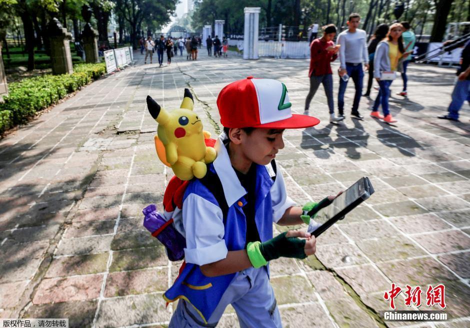 当地时间2016年8月21日,墨西哥举办“口袋妖怪日”,大量民众COSPALY成口袋妖怪中的角色,在街头抓精灵。图为COS主角“小智”的男童在街头。