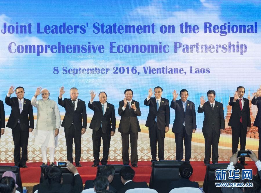 9月8日,中国国务院总理李克强在万象国家会议中心出席第十一届东亚峰会。峰会后,李克强与东盟十国及韩国、日本、印度、澳大利亚、新西兰等国领导人共同出席《区域全面经济伙伴关系协定》联合声明发布仪式。这是发布仪式上,李克强同与会领导人集体合影。新华社记者王晔摄