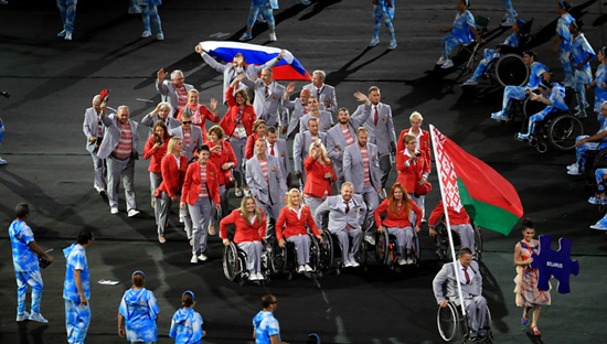 据俄罗斯卫星网9月8日报道,白俄罗斯残奥委会主席奥列格·舍佩尔8日表示,该国代表团在里约残奥会开幕式上举着俄罗斯国旗入场,以示对被禁赛的俄残奥运动员的支持。不过旗帜最后被没收了。.
