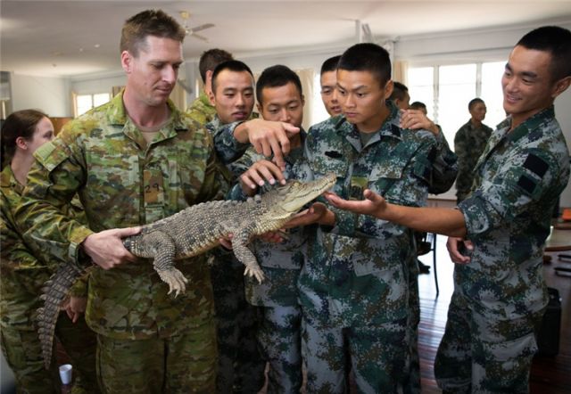 “科瓦里-2016”野外生存训练前夕,澳大利亚陆军中士Dominic Hamon向中方参演官兵介绍野外求生中必不可少的“珍肴”——野生鳄鱼。