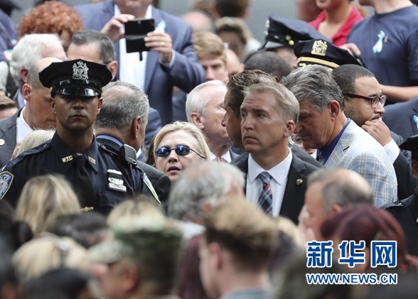 9月11日,在美国纽约,民主党总统候选人希拉里·克林顿(中,戴墨镜者)抵达活动现场。当天,“9·11”恐怖袭击事件15周年纪念活动在美国纽约“9·11”纪念广场举行。 新华社记者王迎摄