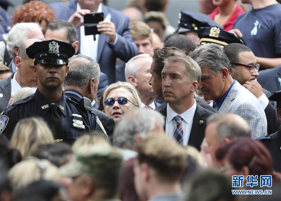 资料图:9月11日,在美国纽约,民主党总统候选人希拉里·克林顿(中,戴墨镜者)抵达活动现场。当天,“9·11”恐怖袭击事件15周年纪念活动在美国纽约“9·11”纪念广场举行。 新华社记者王迎摄